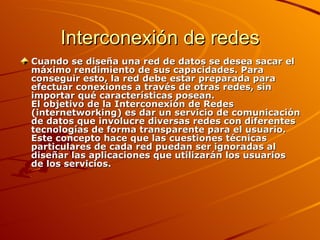 Este documento describe diferentes métodos y dispositivos para interconectar redes, incluyendo concentradores, módems, compuertas, puentes y enrutadores. La interconexión de redes permite que usuarios en redes diferentes se comuniquen de forma transparente a través de diferentes tecnologías de red.