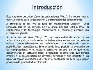 Este capítulo describe cómo las aplicaciones Web 2.0 ofrecen nuevas oportunidades para la generación y distribución del conocimiento a través de la intercreatividad y la inteligencia colectiva de los usuarios. Se explica que plataformas como Wikipedia, Creative Commons y las folksonomías permiten que múltiples usuarios colaboren y generen contenido de forma descentralizada.