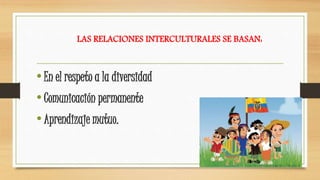 La interculturalidad se define como un proceso de comunicación e interacción horizontal y sinérgica entre dos o más culturas, donde ninguna cultura está por encima de la otra. Las relaciones interculturales se basan en el respeto a la diversidad, la comunicación permanente y el aprendizaje mutuo. La educación intercultural en Ecuador busca promover la equidad educativa y superar la discriminación mediante la valoración de la diversidad cultural y el respeto a todas las culturas.