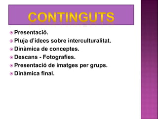 El documento presenta una serie de actividades sobre interculturalidad que incluyen una lluvia de ideas, dinámicas de grupos y presentaciones. También define conceptos clave como globalización, racismo, migración, inmigración, cultura, sociedad multicultural, mediación intercultural e identidad. Por último, recomienda algunos proyectos y recursos relacionados con la interculturalidad.