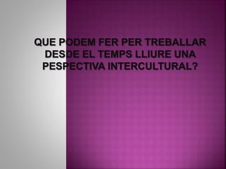 El documento presenta una serie de actividades sobre interculturalidad que incluyen una lluvia de ideas, dinámicas de grupos y presentaciones. También define conceptos clave como globalización, racismo, migración, inmigración, cultura, sociedad multicultural, mediación intercultural e identidad. Por último, recomienda algunos proyectos y recursos relacionados con la interculturalidad.