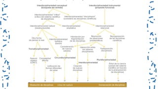 La interdisciplina integra los conocimientos de diferentes disciplinas para resolver problemas de manera holística. En la Nueva Escuela Mexicana, la interdisciplina se construye a través de la integración curricular, la autonomía profesional, la comunidad y el derecho a la educación. Los campos formativos y ejes articuladores conectan los saberes de distintas disciplinas y vinculan los procesos de enseñanza y aprendizaje con la realidad de los estudiantes. Los cuatro fines de la interdisciplina son formar ciudadanos mediante proces
