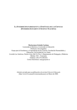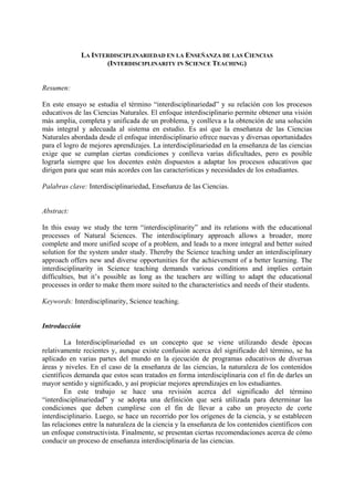 Este documento discute la importancia de la interdisciplinariedad en la enseñanza de las ciencias. Se define la interdisciplinariedad como el uso de métodos y conocimientos de diferentes disciplinas para abordar un problema que no puede resolverse desde una sola disciplina. La enseñanza interdisciplinaria de las ciencias ofrece una visión más amplia y completa de los temas científicos y conduce a mejores aprendizajes para los estudiantes. Aunque requiere que los docentes estén dispuestos a adaptar sus métodos de enseñanza