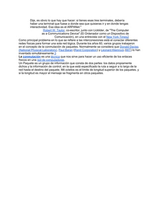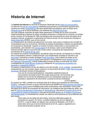 La historia de Internet se remonta a las primeras redes de comunicación desarrolladas en la década de 1950. En la década de 1960, pioneros como Licklider comprendieron la necesidad de una red mundial de computadoras conectadas que permitiera la comunicación entre usuarios. En la década de 1980, tecnologías como ARPANET empezaron a expandirse, sentando las bases para la Internet moderna. En los 1990 se introdujo la World Wide Web, haciendo Internet accesible a nivel mundial.