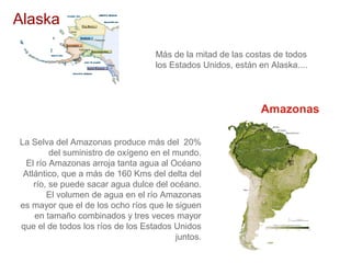 El documento presenta breves datos interesantes sobre diversos lugares del mundo como Alaska, Amazonas, Antártica, Brasil, Canadá, Chicago, Detroit, Damasco, Estambul, Los Ángeles, Nueva York, Ohio, Isla Pitcairn, Roma, Siberia, Orden de Malta, Desierto del Sahara, España, Colombia, Rusia, Estados Unidos y Cataratas. Algunos de los datos incluyen que más de la mitad de las costas de EE.UU. están en Alaska, la selva amazónica produce el 20% del oxígeno mundial y el