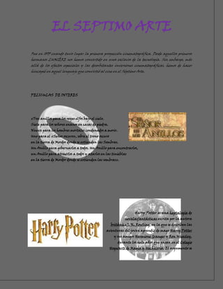 El documento habla sobre el séptimo arte, el cine, destacando que surgió en 1895 con las primeras proyecciones de los hermanos Lumière y cómo con el tiempo se ha convertido en una industria tecnológica masiva. Sin embargo, resalta que más allá de los efectos especiales, es importante el lenguaje cinematográfico que convirtió al cine en un arte. Luego menciona algunas películas y series de televisión populares como El Señor de los Anillos, Harry Potter y Extreme Makeover.