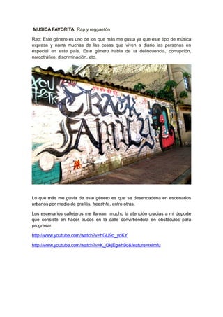 El documento describe los intereses y pasatiempos de una persona. Disfruta del skateboarding, el cual ha practicado por más de 5 años y le ha brindado oportunidades como viajar y competir. También le gusta el rap y el reggaetón porque expresan las experiencias de la gente y le dan energía para bailar. Otro hobby es jugar fútbol para interactuar con otros y mantenerse en forma. Sus series de televisión favoritas son Los Simpson y El Chavo del Ocho, que siempre lo hacen reír y entretienen de manera sana.