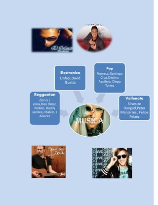 Este documento lista varios temas de interés como deportes, música, hobbys, programas de televisión y películas favoritas. Incluye deportes como baloncesto, gimnasia y voleibol, así como géneros musicales como la música electrónica, el pop, el reggaeton y el vallenato. También menciona hobbys como dibujar, viajar y ver documentales de Animal Planet, así como programas de televisión como Phineas y Ferb, Caso Cerrado y el Doctor House. Finalmente, enumera películas de