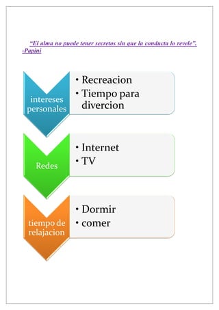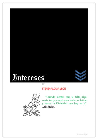 Este documento presenta los intereses personales de Steven Aldana León. Sus principales intereses incluyen el tiempo libre, recreación, deportes como fútbol y baloncesto, series de televisión de diferentes géneros, música de varios artistas y pasar tiempo para relajarse y divertirse.