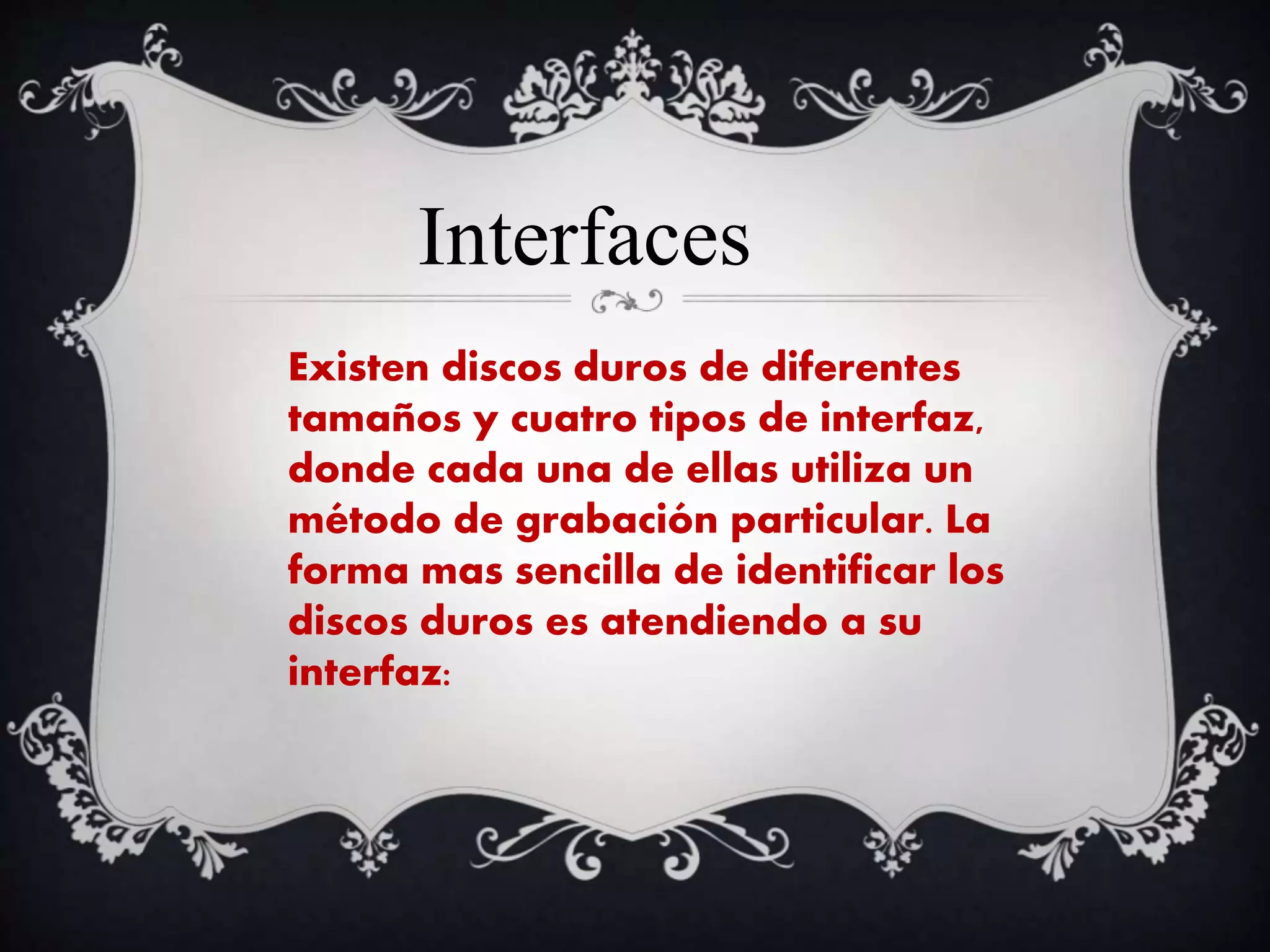 Existen cuatro tipos principales de interfaces para discos duros: ST506/ST412, ESDI, SCSI e IDE. Cada interfaz utiliza un método de transferencia de datos diferente y permite diferentes tasas de transferencia, con SCSI y ESDI siendo las más rápidas. Los discos duros también varían en tamaño de capacidad dependiendo del tipo de interfaz, con discos SCSI teniendo las mayores capacidades hasta 300GB y discos IDE las menores hasta 750GB.