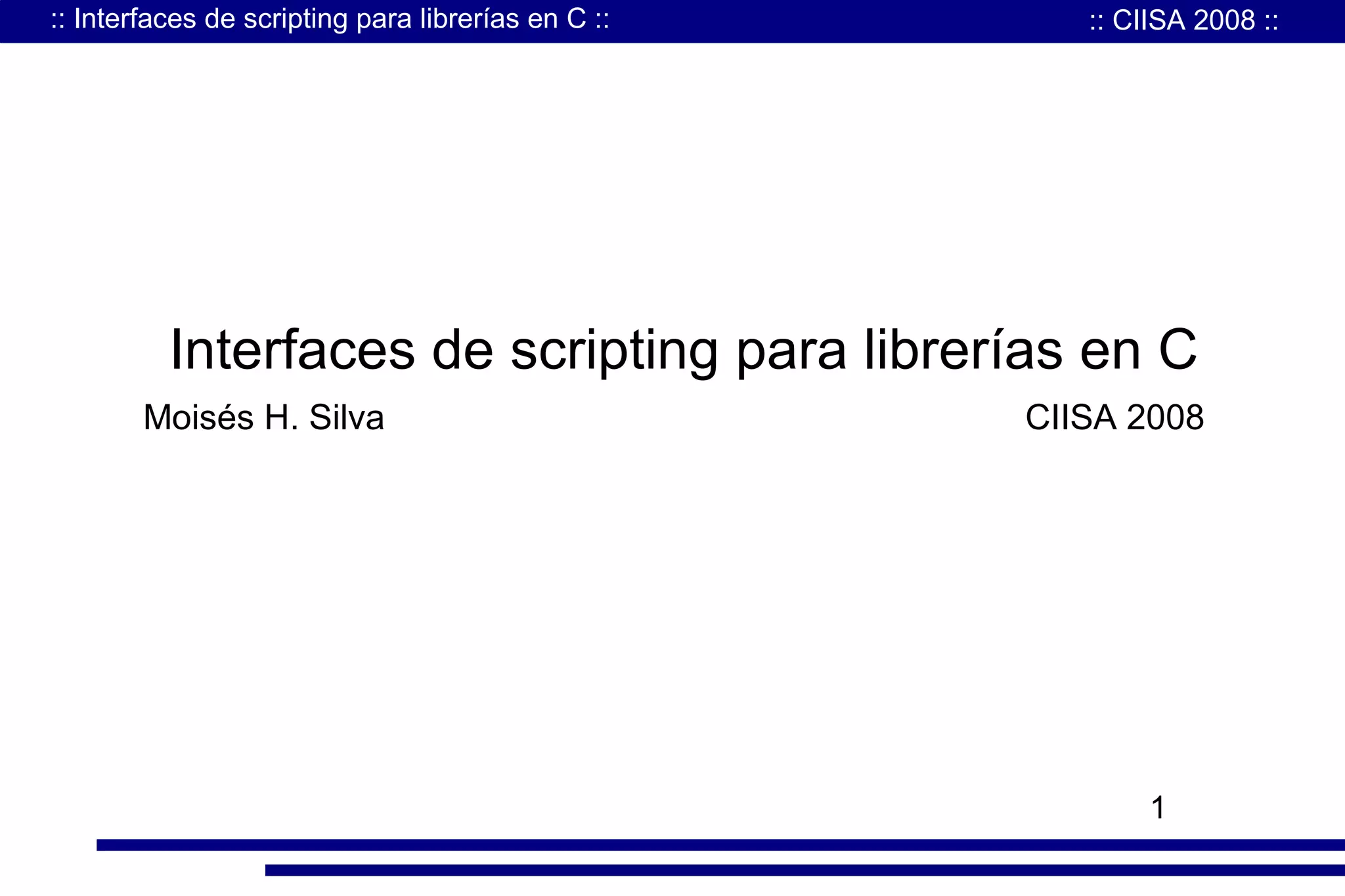 El documento trata sobre las interfaces de scripting para librerías en C. Explica los lenguajes de scripting como PHP, PERL y Python, y cómo se pueden crear extensiones en C para estos lenguajes para exponer la funcionalidad de librerías en C. Describe el funcionamiento del Zend Engine, el núcleo de PHP, y cómo se pueden construir extensiones en C para PHP registrando funciones, clases, variables y otras estructuras de datos.