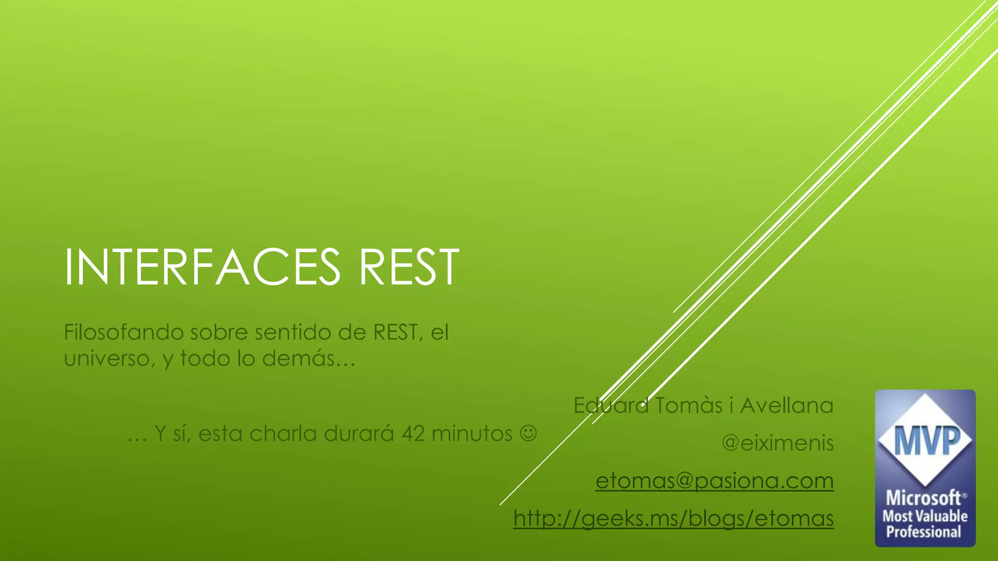 La charla aborda la filosofía y principios del estilo arquitectónico REST, enfatizando su escalabilidad y requisitos básicos. Se presentan niveles de madurez de REST, el diseño de APIs, uso adecuado de verbos HTTP, gestión de errores y códigos de respuesta. También se discuten aspectos como versionado, respuestas parciales y medidas de seguridad como OAuth.