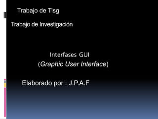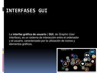 Este documento describe las interfaces gráficas de usuario (GUI), incluyendo sus tipos principales (interfaz frontal y trasera), características (ventanas, iconos, menús) y funciones (diseño, presentación, lógica de aplicación). También menciona que las GUI permiten interactuar con sistemas operativos como Windows, Mac OS y Linux a través de elementos gráficos en lugar de comandos de texto.