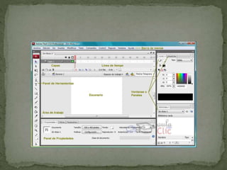 El documento describe la barra de menús de Adobe Flash, la cual proporciona acceso a herramientas para crear, abrir y guardar archivos, importar otros archivos, configurar la publicación, cortar, copiar y pegar objetos o fotogramas, moverse entre fotogramas y escenas, insertar nuevos elementos, modificar gráficos, administrar comandos, configurar la reproducción, depurar errores, gestionar ventanas y paneles, y acceder a ayuda y documentación.