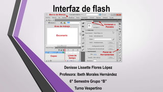 La interfaz de Flash incluye menús como Archivo y Edición, paneles para herramientas y propiedades, y vistas como la línea de tiempo y el escenario. Ofrece herramientas para dibujar, seleccionar objetos, y trabajar con capas, colores y fotogramas para crear animaciones.
