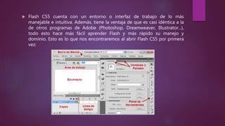 El documento describe la interfaz de Flash CS5, incluyendo la barra de menús, la línea de tiempo, las capas y el escenario. Explica que la barra de menús facilita el acceso a las utilidades del programa, la línea de tiempo representa la sucesión de fotogramas en el tiempo, las capas permiten separar objetos para que no interfieran, y el escenario es donde se dibujan y colocan los elementos de la película. También describe las herramientas básicas como la selección, texto, línea, forma y pincel