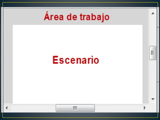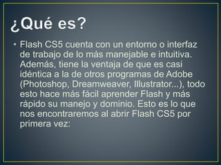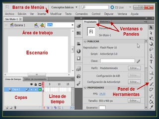 El documento describe las características principales de la interfaz de usuario de Adobe Flash CS5. Explica que la interfaz es intuitiva y similar a otros programas de Adobe como Photoshop e Illustrator. Describe los menús principales como Archivo, Edición, Ver, Insertar y otros, y explica las funciones básicas de cada uno. También describe el área de trabajo principal que incluye el escenario y la línea de tiempo, así como las capas, paneles y otras herramientas.
