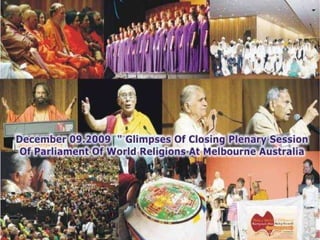 El documento resume varios eventos y encuentros internacionales de Brahma Kumaris con diferentes líderes religiosos y espirituales a través de los años, incluyendo el Dalai Lama, Madre Teresa, el Papa Juan Pablo II, y Swami Harinanda. También incluye un mensaje de Dadi Janki en el Parlamento de Religiones del Mundo en 2009 sobre la necesidad de experimentar la verdad, el amor y la misericordia de Dios, y compartir esa vibración con el mundo para alcanzar la paz.