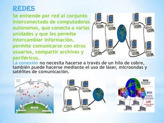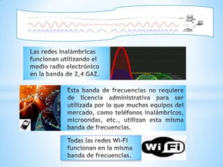 El documento trata sobre las redes inalámbricas. Explica que una red inalámbrica conecta computadoras de forma inalámbrica mediante ondas de radio, y que la norma más común es 802.11b (Wi-Fi). También indica que la velocidad máxima de 802.11b es de 11 Mbps, pero la velocidad típica es de 1,5 a 5 Mbps, y que las redes inalámbricas pueden tener interferencias de campos electromagnéticos u otros dispositivos eléctricos.