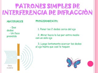 El primer documento describe un experimento sencillo de interferencia óptica usando los dedos. El segundo documento explica cómo hacer un disco de Newton casero usando un CD, papel, colores y una canica. El tercer documento presenta un experimento para determinar el color de una mancha de aceite bajo luz y trasluz.