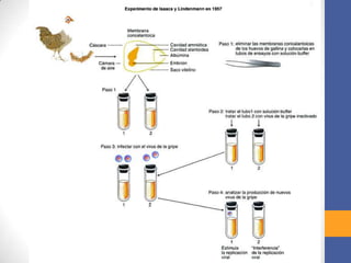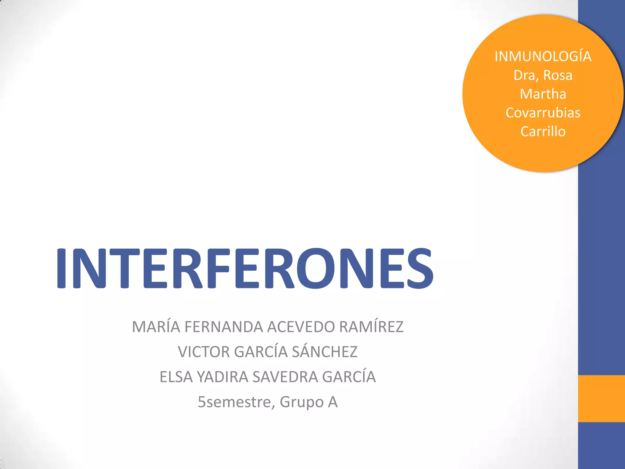 Los interferones son proteínas producidas en respuesta a infecciones virales que inhiben la replicación de virus. Existen tres tipos principales: interferón alfa, producido por leucocitos; interferón beta, producido por fibroblastos; e interferón gamma, producido por linfocitos. Todos actúan para inducir una respuesta antiviral en las células. Los interferones se usan clínicamente para tratar infecciones virales y algunos tipos de cáncer.