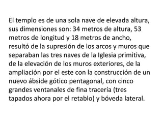 El templo es una gran nave de 34 metros de altura, 53 de longitud y 18 de ancho. Tiene tres bóvedas de crucería y ventanales góticos. Destacan el retablo mayor del siglo XVII y el camarín barroco de la Virgen del Prado, patrona de la ciudad. El templo alberga diversas capillas, la sacristía nueva de planta octogonal y la sala capitular con bóveda de crucería decorada.