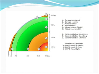 El documento describe los métodos utilizados para estudiar la composición y estructura interna de la Tierra. Los métodos directos estudian materiales de las capas superficiales, mientras que los métodos indirectos como las ondas sísmicas y las características magnéticas y gravitacionales de la Tierra proporcionan información sobre las capas más profundas. El análisis de las ondas sísmicas revela que la Tierra está formada por una corteza, un manto y un núcleo.