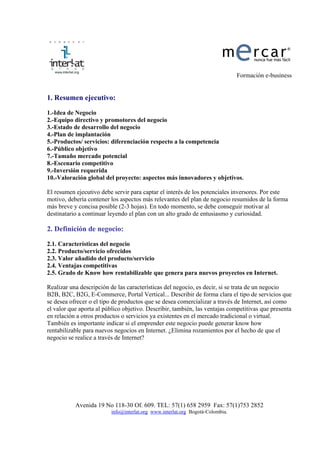 El documento proporciona una guía para desarrollar un plan de negocios para servicios en línea, destacando su importancia tanto como herramienta de análisis como carta de presentación para inversionistas y socios. Detalla la estructura del plan, que incluye un resumen ejecutivo, definición del negocio, mercado objetivo, estrategias de marketing, requerimientos tecnológicos y un análisis DAFO. También se enfatiza la necesidad de un enfoque claro y conciso en la presentación para captar la atención de posibles inversores.