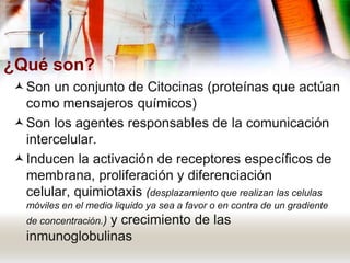 Las interleucinas son proteínas mensajeras que regulan la comunicación entre las células del sistema inmune. Algunas interleucinas como la IL-1, IL-6 e IL-18 atraen macrófagos a sitios de infección y activan la respuesta inmune innata, mientras que IL-2, IL-4 e IL-13 regulan la respuesta adaptativa de los linfocitos T y B. Otras como IL-3, IL-5 e IL-7 estimulan la producción de células sanguíneas.