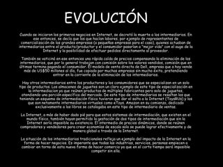 El documento describe la evolución de los intermediarios y los tipos de intermediarios basados en Internet. Originalmente se predijo que Internet eliminaría a los intermediarios, pero en realidad han surgido nuevos tipos de intermediarios electrónicos. El documento luego explica las funciones de los intermediarios electrónicos y varios tipos específicos como directorios, centros comerciales virtuales, revisores de sitios web y agentes inteligentes.