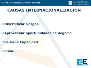 El documento aborda el máster en dirección y gestión de pymes, destacando la internacionalización como una estrategia para diversificar riesgos y aprovechar oportunidades. Detalla el proceso de elección de un país, la importancia de análisis de riesgo y la colaboración con socios locales, así como ejemplos de proyectos en el Golfo Pérsico y en Marruecos y Argelia. Además, menciona las dificultades como la distancia, el idioma y la necesidad de personal cualificado para la implantación en el extranjero.