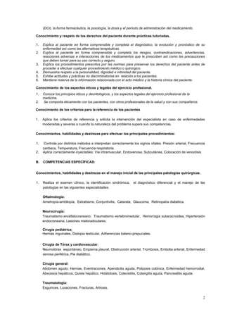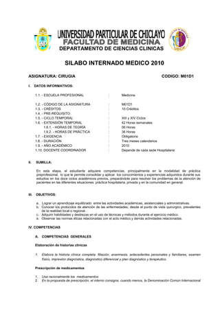 Este documento presenta el plan de estudios para la asignatura de Cirugía del internado médico de 2010. El internado dura tres meses y los estudiantes desarrollarán competencias a través de la atención de pacientes hospitalizados, en emergencias y en la comunidad. Los objetivos incluyen adquirir habilidades quirúrgicas, conocer protocolos para enfermedades comunes y observar principios éticos. Los estudiantes serán evaluados en sus habilidades clínicas, seminarios y conocimientos teóricos.