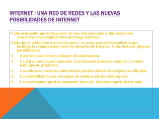 Internet permite la conexión de ordenadores de todo el mundo independientemente del sistema operativo o red que utilicen. Se ha convertido en un gran almacén de información, mercado global y plataforma para la difusión de culturas. Ha evolucionado desde su creación como red militar estadounidense (ARPANET) hasta convertirse en la red mundial que es hoy gracias a innovaciones como el protocolo TCP/IP, el navegador web y los buscadores.
