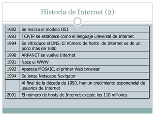 El documento resume la historia de Internet desde sus inicios en la década de 1960 como una red militar estadounidense llamada ARPANET, hasta su crecimiento como una red mundial de computadoras en la década de 1990. Algunos hitos clave incluyen el desarrollo de TCP/IP en 1983, la creación de la World Wide Web en 1991 y el rápido crecimiento de usuarios a fines de la década de 1990. El documento también explica conceptos técnicos clave como protocolos, direcciones IP, nombres de dominio y navegadores web.