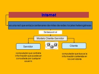 Internet es una red mundial de millones de computadoras que ofrece varios servicios como la World Wide Web. Para conectarse a Internet se necesita un módem común de 56 kbps y una línea contratada con una empresa de telecomunicaciones que proporcione el acceso.