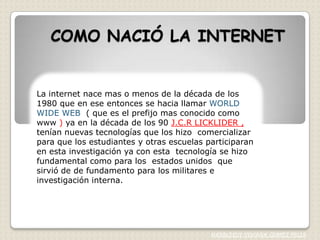 La Internet surgió en la década de 1980 como la World Wide Web, permitiendo la conexión entre computadoras a través de redes de comunicación. En los años 90, investigadores como J.C.R. Licklider impulsaron su desarrollo comercial para uso académico y militar en EE.UU. Actualmente, la Internet ofrece servicios como correo electrónico, la web, chats y comercio electrónico, conectando usuarios a nivel mundial a través de redes como WAN, LAN y MAN.
