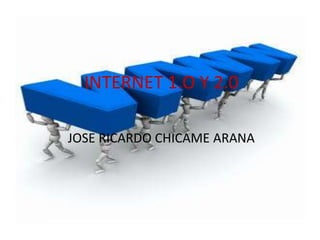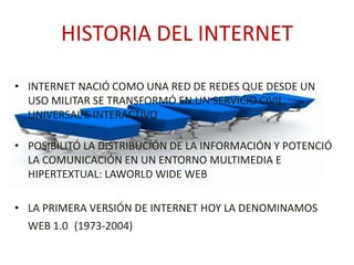 El documento describe la evolución de Internet. La versión 1.0 (1973-2004) permitió distribuir y comunicar información de forma multimedia e hipertextual a través de la World Wide Web, pero era solo de lectura. La versión 2.0 es más interactiva, permite compartir información y que los usuarios interactúen y cambien contenidos a través de las redes sociales.