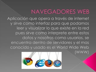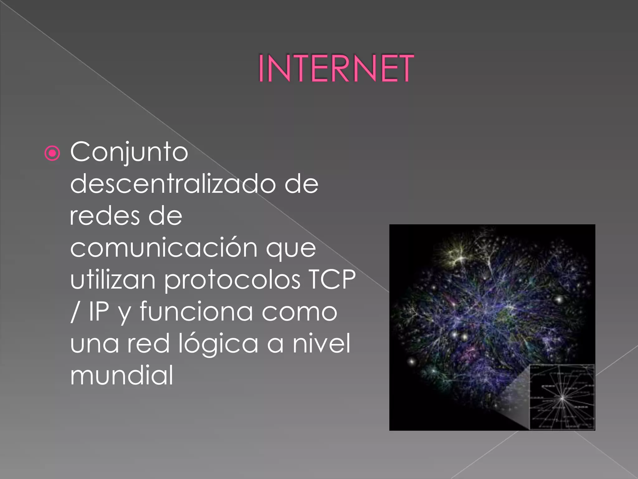 Internet se originó como una red militar estadounidense en la década de 1960 y desde entonces se ha expandido a una red global descentralizada que usa protocolos TCP/IP. Fue desarrollado el primer navegador web en 1990 en el CERN para navegar entre páginas web y desde entonces internet se ha vuelto omnipresente, con más de 2,000 millones de usuarios previstos en los próximos 10 años, y se usa ampliamente tanto para comunicación como para entretenimiento y difusión de información.