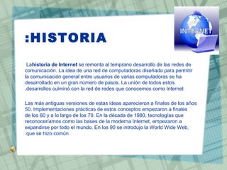 El documento resume la historia de Internet desde sus inicios en las décadas de 1950 y 1960 hasta su expansión mundial en los 1990. Las primeras versiones de redes de computadoras aparecieron a finales de los 1950, con implementaciones prácticas en los 1960 y 1970. En los 1980, tecnologías como ARPANET y X.25 sentaron las bases de la Internet moderna. La World Wide Web se introdujo en los 1990 y permitió la expansión global de Internet, aunque también creó una brecha digital. Internet transformó la economía mundial y permitió servicios como correo electrónico,