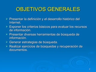 El documento presenta una introducción al uso de Internet y las herramientas para encontrar información confiable. Explica brevemente la historia y evolución de Internet, criterios para evaluar páginas web, y diferentes herramientas de búsqueda como buscadores, metabuscadores, directorios y bibliotecas virtuales. Finalmente, propone un ejercicio práctico de búsqueda usando estas herramientas.