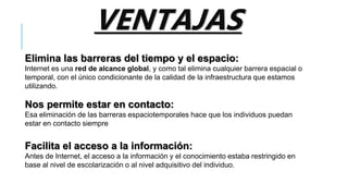 Este documento resume las principales ventajas y desventajas del Internet. Las ventajas incluyen que elimina las barreras del tiempo y el espacio, nos permite estar en contacto, y facilita el acceso a la información. Algunas desventajas son el exceso de información, problemas de privacidad, y que puede incitar al sedentarismo.