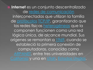 Internet es una red mundial descentralizada de redes interconectadas que usan protocolos TCP/IP para funcionar como una sola red lógica. Se originó en 1969 con la primera conexión entre universidades en California y Utah creando la red ARPANET. Los navegadores web como Chrome, Firefox e Internet Explorer permiten a los usuarios acceder e interactuar con páginas web al interpretar el código HTML y mostrar el contenido.
