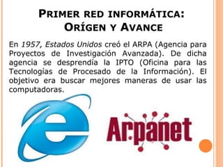 El internet es una red global que conecta computadoras y redes desde su origen en la década de 1960, surgido a partir de proyectos de investigación en EE. UU. Sus principales características incluyen ser accesible, fácil de usar y abarcar una variedad de actividades, desde navegar hasta interactuar en redes sociales. La conexión a internet requiere un ordenador, módem y proveedor, siendo el protocolo HTTP el más común en la web.