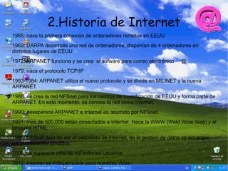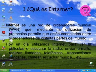 Internet es una red mundial de ordenadores conectados que permite compartir información. Se desarrolló en la década de 1960 y ha crecido exponencialmente, con más de mil millones de usuarios en todo el mundo que usan protocolos como TCP/IP. Las personas usan Internet para muchos propósitos como comunicarse, buscar información, comprar productos y servicios, y participar en comunidades virtuales como foros, redes sociales y wikis.