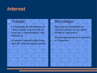 El documento resume las ventajas y desventajas del uso de Internet. Entre las ventajas se encuentra que facilita la comunicación y el acceso a información de todo el mundo, y permite descargar software libre y actualizaciones. Entre las desventajas figuran que puede distraer e inducir dependencia, y que también se puede encontrar información dañina o ilegal.