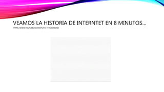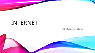 Internet comenzó en 1969 como ARPANET, una red de computadoras entre universidades en California y Utah. Aunque a menudo se confunden, la World Wide Web es un servicio desarrollado en los años 90 que usa protocolos para acceder de forma remota a archivos de hipertexto a través de Internet. Internet es una red descentralizada de redes interconectadas que usan protocolos TCP/IP para funcionar como una red global, y aloja diferentes tipos de información en servidores pertenecientes a universidades, empresas e instituciones.