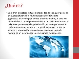 Internet es la gran biblioteca virtual mundial que permite el acceso global a información, entretenimiento y oportunidades laborales. Tuvo su origen en la década de 1960 como una red militar estadounidense llamada Arpanet, la cual evolucionó para usar protocolos como TCP/IP y hacer Internet accesible al público en los 1980s-1990s. Internet permite la comunicación global, el entretenimiento y la obtención de información, aunque también plantea desafíos como la calidad variable de la información y la exposición a contenidos no deseados.