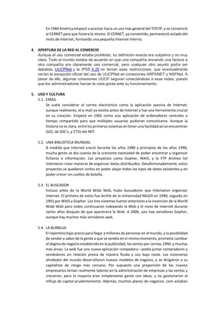 La Internet se originó en 1969 como ARPANET, una red de comunicación entre universidades en California. ARPANET evolucionó para incluir más nodos y protocolos como TCP/IP, expandiéndose a nivel mundial y dando origen a la Internet moderna. La Internet ha crecido exponencialmente desde la década de 1980, impulsada por innovaciones como el correo electrónico, el World Wide Web, los buscadores y las empresas .com. Existe un debate sobre si la Internet mantendrá su carácter global y abierto o si se fragmentará en varias redes locales en el futuro