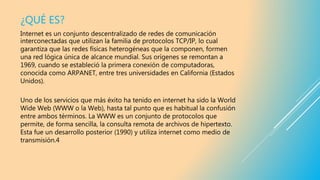 Internet es una red mundial de redes interconectadas que usan protocolos TCP/IP. Se originó en 1969 como ARPANET para conectar universidades en California. La World Wide Web, desarrollada en 1990, utiliza internet para permitir la consulta remota de archivos de hipertexto de forma sencilla. Internet ahora permite la educación distribuida, el trabajo remoto y colaborativo, y da acceso a grandes cantidades de información en línea.
