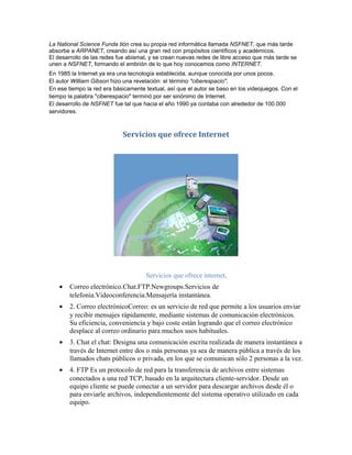 Internet es una red global de redes interconectadas que usa el protocolo TCP/IP para permitir la comunicación entre computadoras. Ofrece varios servicios como correo electrónico, chat, transferencia de archivos y páginas web accesibles a través de navegadores. La World Wide Web proporciona un sistema de distribución de información en forma de hipertexto e hipermedia enlazados a través de Internet.